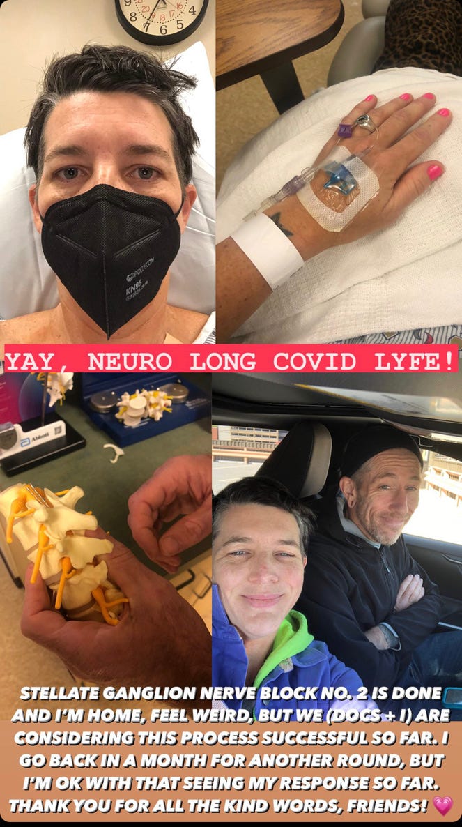 Stellate ganglion nerve blocks: life changing and I am hoping that 4 treatments are the magical number for me. If you are also dealing with Long Covid, please research this procedure to see if it would be helpful for what you are experiencing.